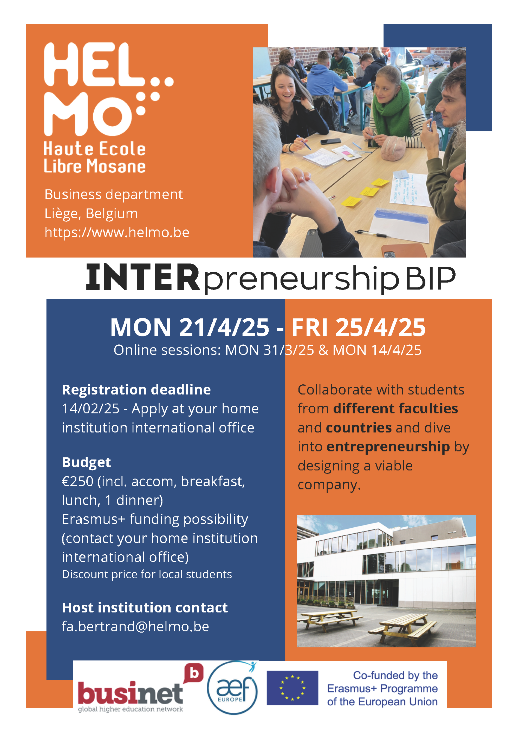 Ce programme a pour but de permettre aux étudiant·e·s de HELMo et à un panel d’étudiant·e·s d’écoles européennes partenaires de collaborer sur le thème de l’entrepreneuriat. Le projet étant destiné à un public étudiant international, il se déroulera donc en anglais.