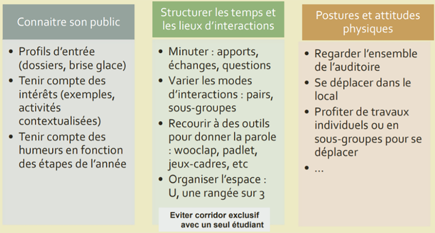 Il est également important de considérer les différents espaces de classe comme étant des espaces de socialisation à part entière où l’enseignant à un rôle à jouer : prendre le temps d’accueillir les étudiants, de les reconnaitre, d’accorder de la place à un climat de groupe, de penser les dispositifs de travail collectif en amont.