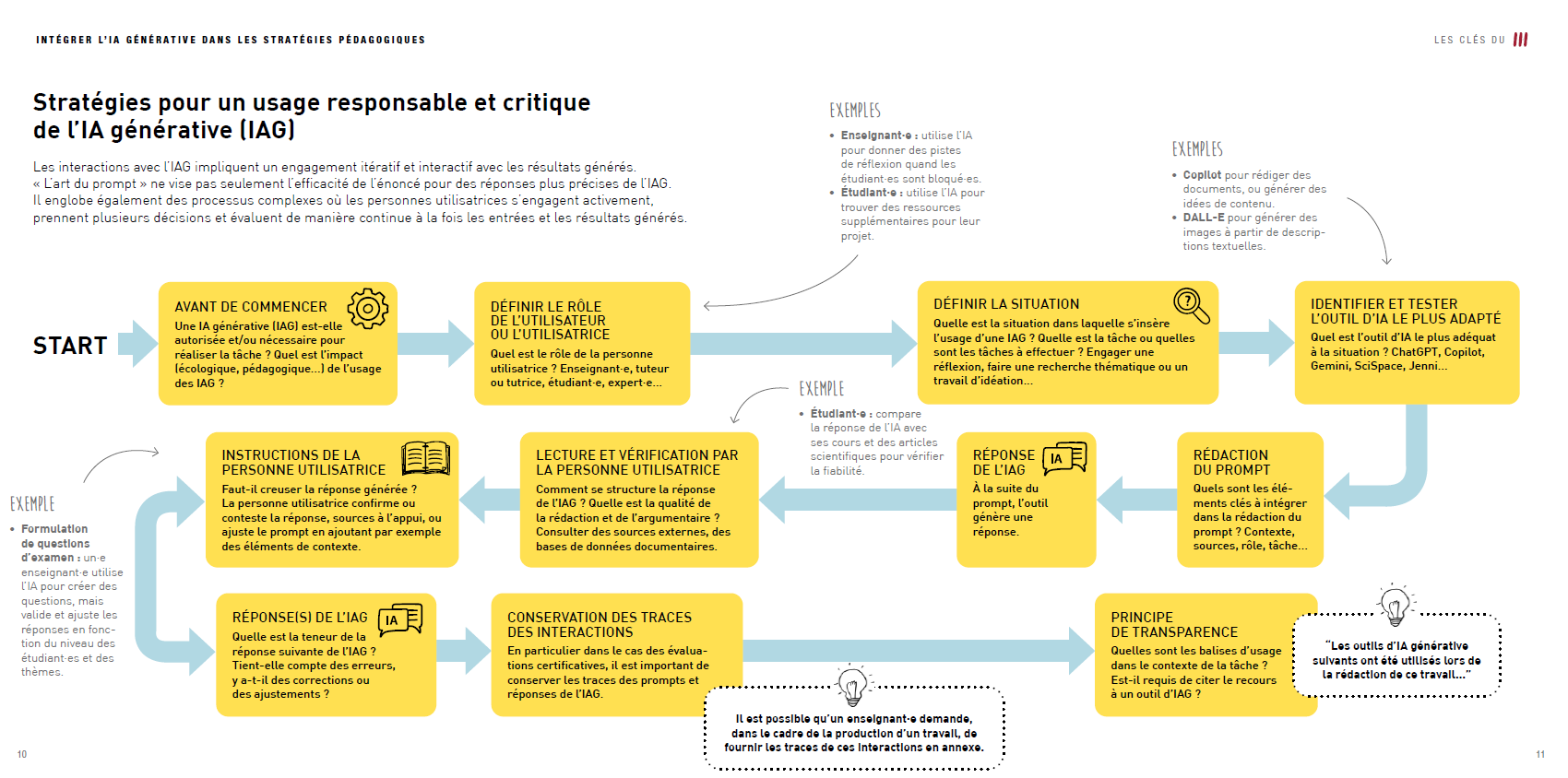 Ainsi, dans un de ses cahiers reprenant les stratégies pour un usage responsable et critique de l’IA générative, l'UCLouvain publie cette infographie montrant que l'art du prompt ne se limite pas à formuler des demandes efficaces. Il inclut aussi une série de choix, d’ajustements et d’évaluations successives, où l’utilisateur analyse continuellement ses requêtes et les réponses générées.