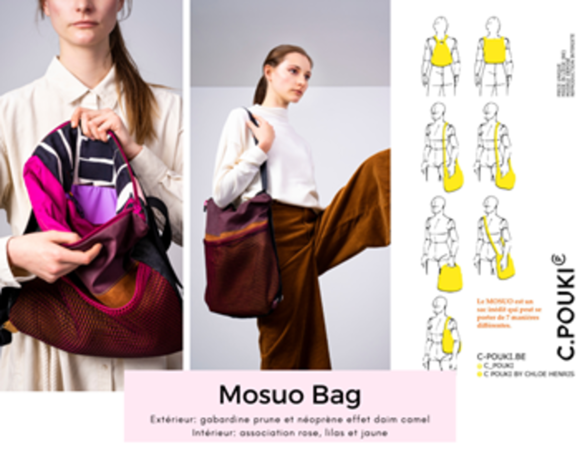 Parallèlement à ses formations, Chloé invente le sac Mosuo*, un sac innovant qui se porte de 7 façons différentes (sac à dos le matin, en bandoulière la journée ou sac à main en soirée, sans devoir le vider à chaque changement).