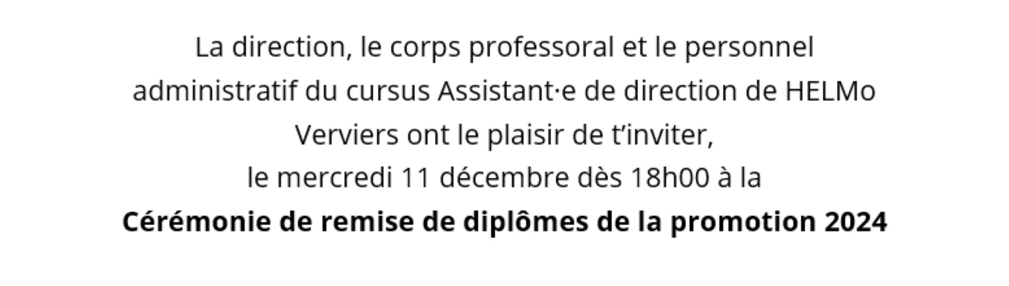 Les diplômé·e·s Assistant·e de Direction de HELMo Verviers , promo 2024 sont attendu·e·s à partir de 18h00.