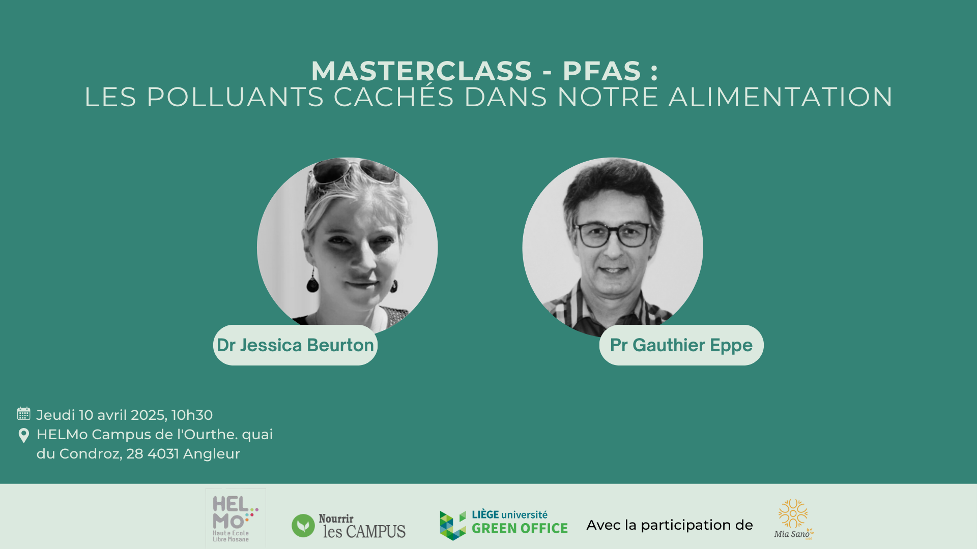 Un échange dynamique sur un enjeux de société majeur ! Les PFAS, ces substances chimiques omniprésentes dans notre quotidien, représentent une menace invisible, notamment à travers leur présence dans notre alimentation. Cette masterclass, animée par le Dr Jessica Beurton, membre du projet Docteur Coquelicot et enseignante dans le Département Paramédical de HELMo, et le professeur Gauthier Eppe de l'ULiège, se concentrera sur les liens entre ces polluants environnementaux et nos habitudes alimentaires. À travers une série de publications et de recherches approfondies, les intervenants nous expliqueront comment ces substances toxiques se retrouvent dans nos produits alimentaires et les risques qu’elles posent à long terme pour notre santé. Un sujet brûlant, essentiel pour comprendre comment notre environnement et nos choix alimentaires sont interconnectés.