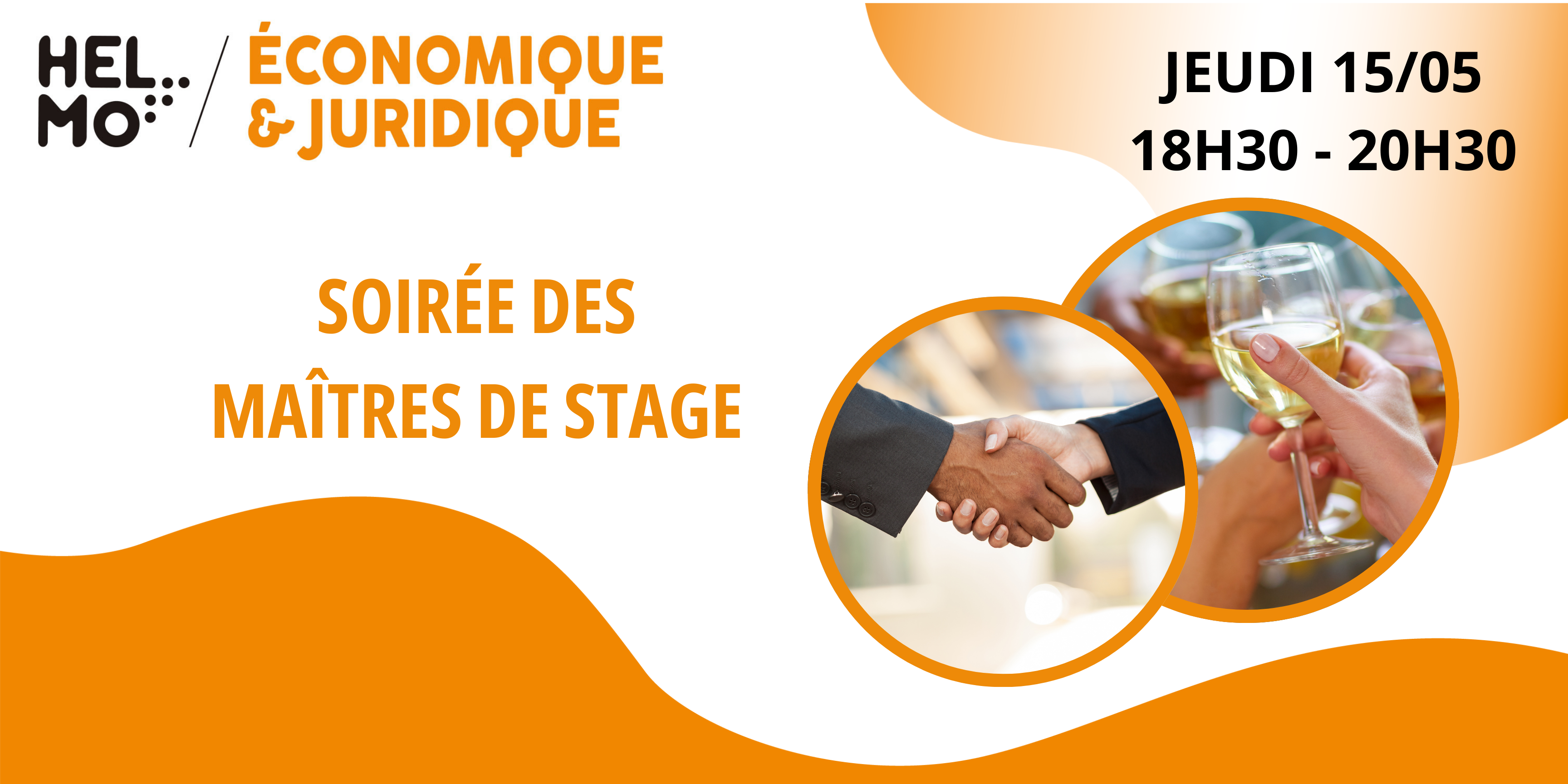Les directions et les enseignants des cursus économiques et juridiques de la Haute Ecole HELMo ont le plaisir de vous convier à la soirée des maîtres de stage, accompagné.e par l'étudiant.e que vous accueillez, ce jeudi 15 mai à partir de 18h30, à HELMo Campus Guillemins.