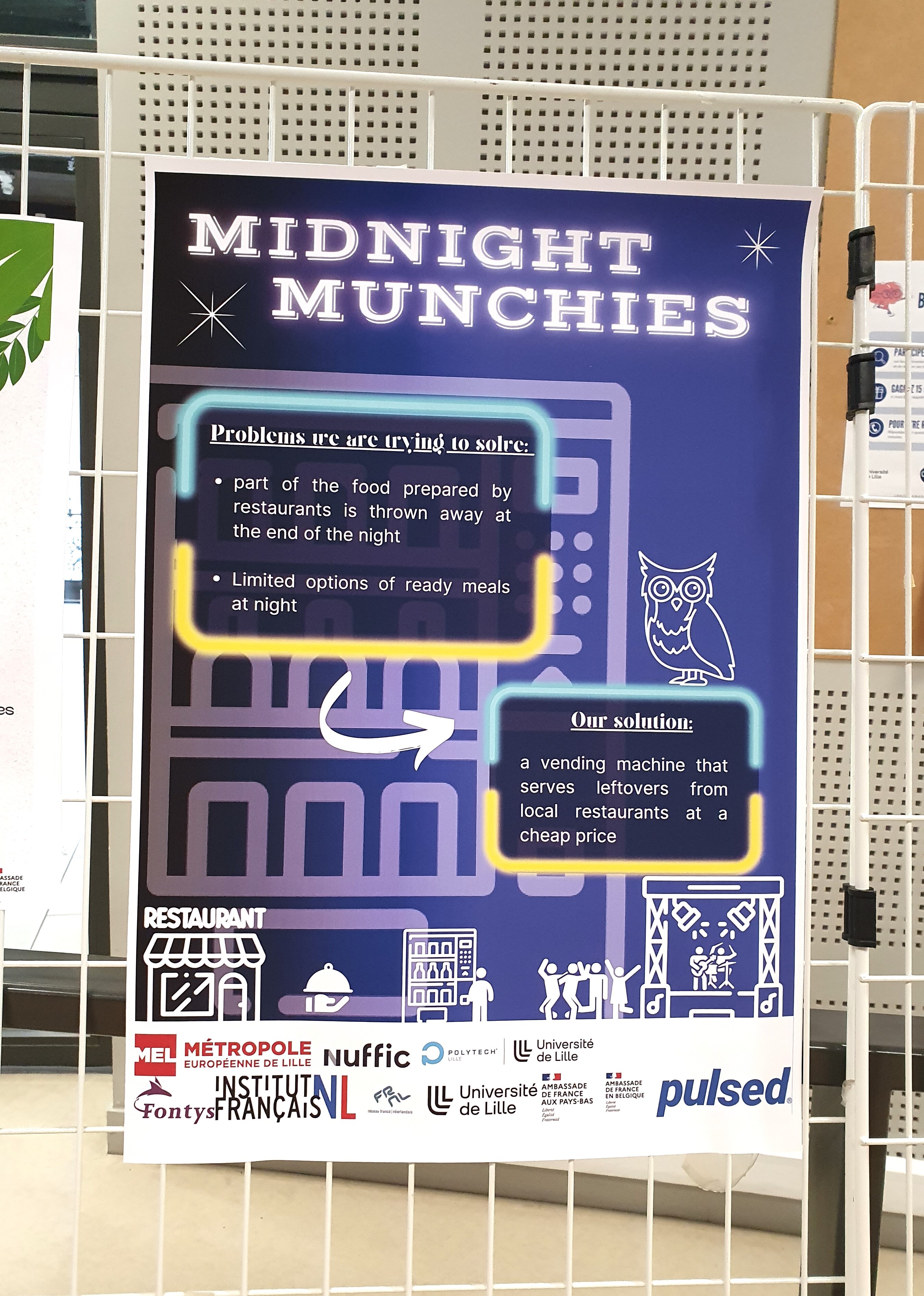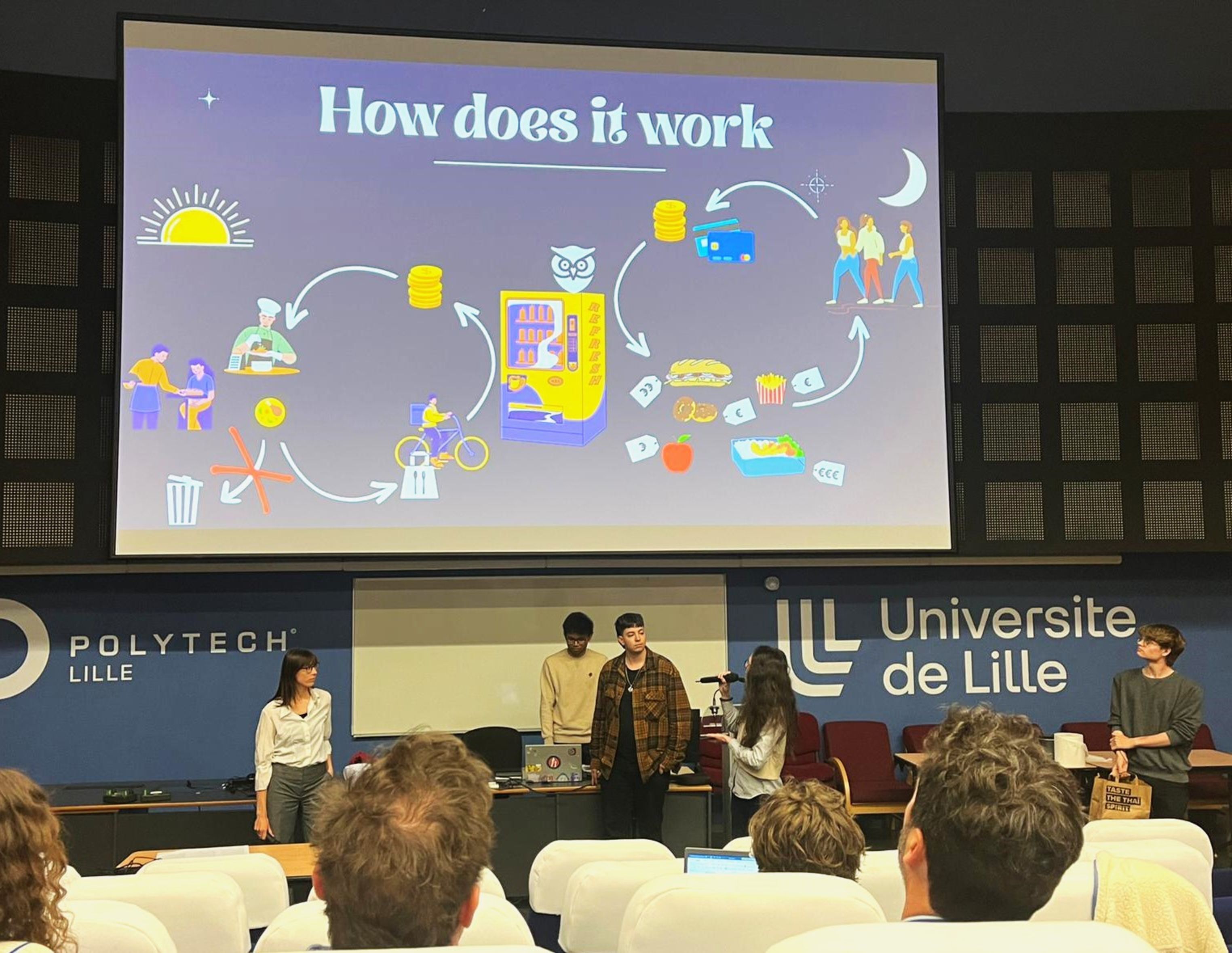 Le groupe d'Alexia a élaboré un projet de mise en place de distributeurs automatiques disponibles la nuit et proposant les restes reconditionnés des restaurants alentour afin d'éviter le gaspillage alimentaire tout en offrant une alternative qualitative au public en recherche de nourriture à emporter de nuit.