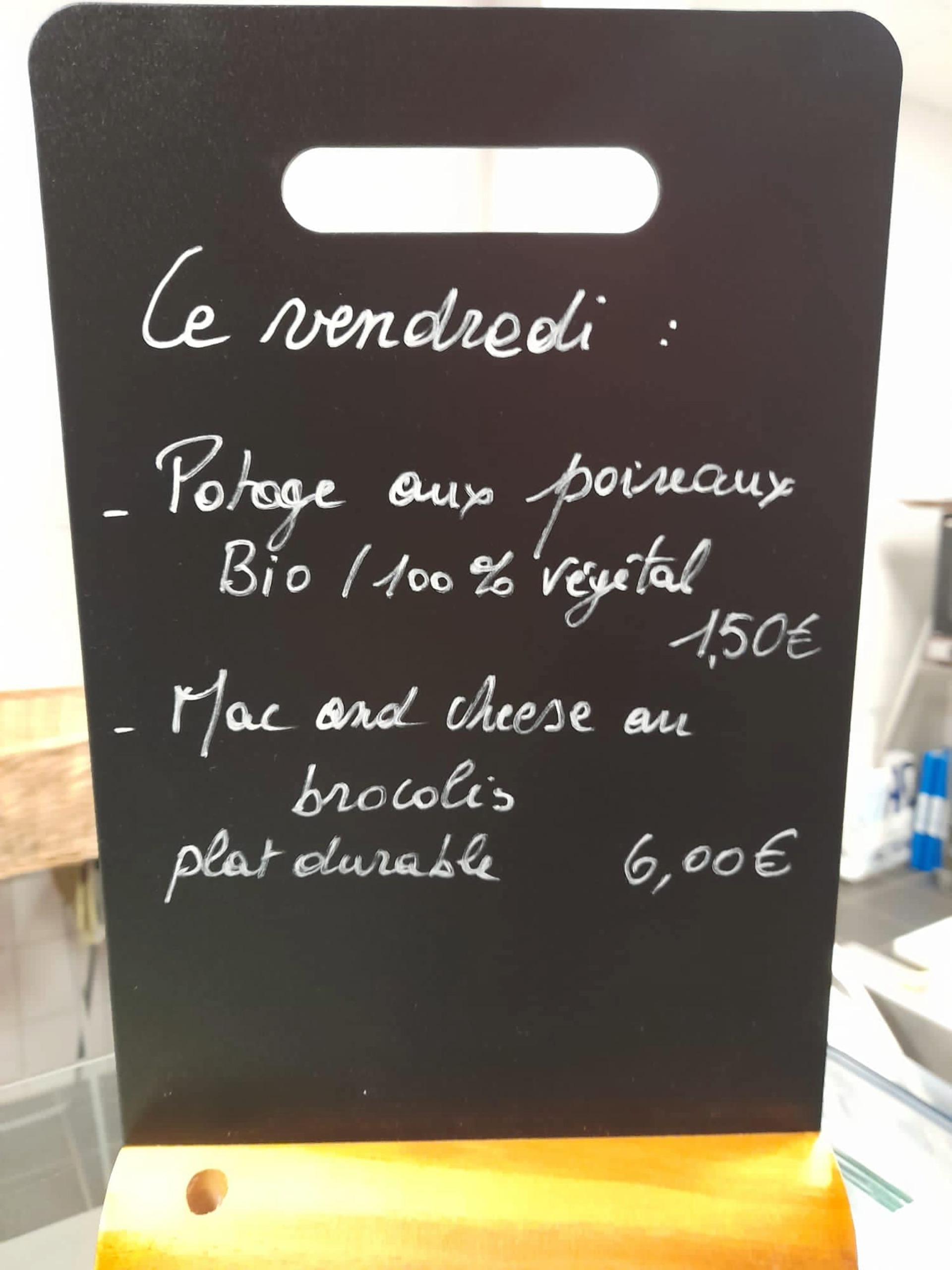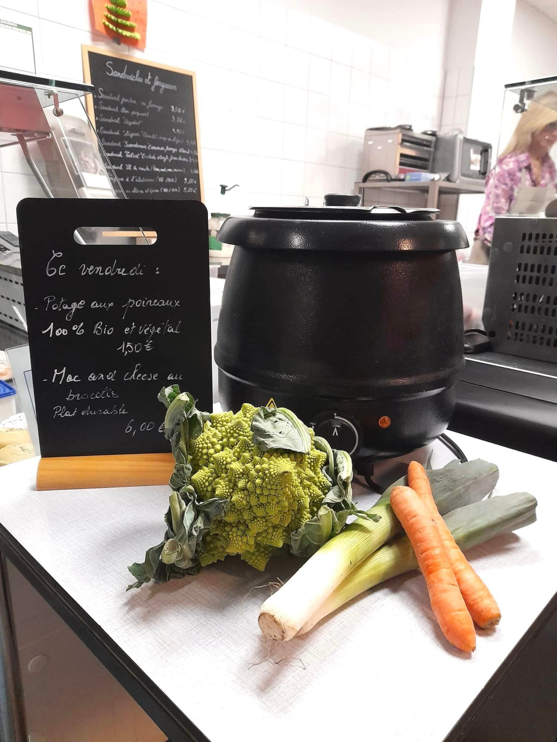En plus de menus quotidiens repensés et réduits, pour répondre à ces critères (notamment une nouvelle carte de sandwiches, de fougasses durables, qui évoluera au fil des saisons, ou encore des cookies bios), des repas chauds et des potages durables spécifiques sont proposés chaque vendredi, depuis le 15 mars.