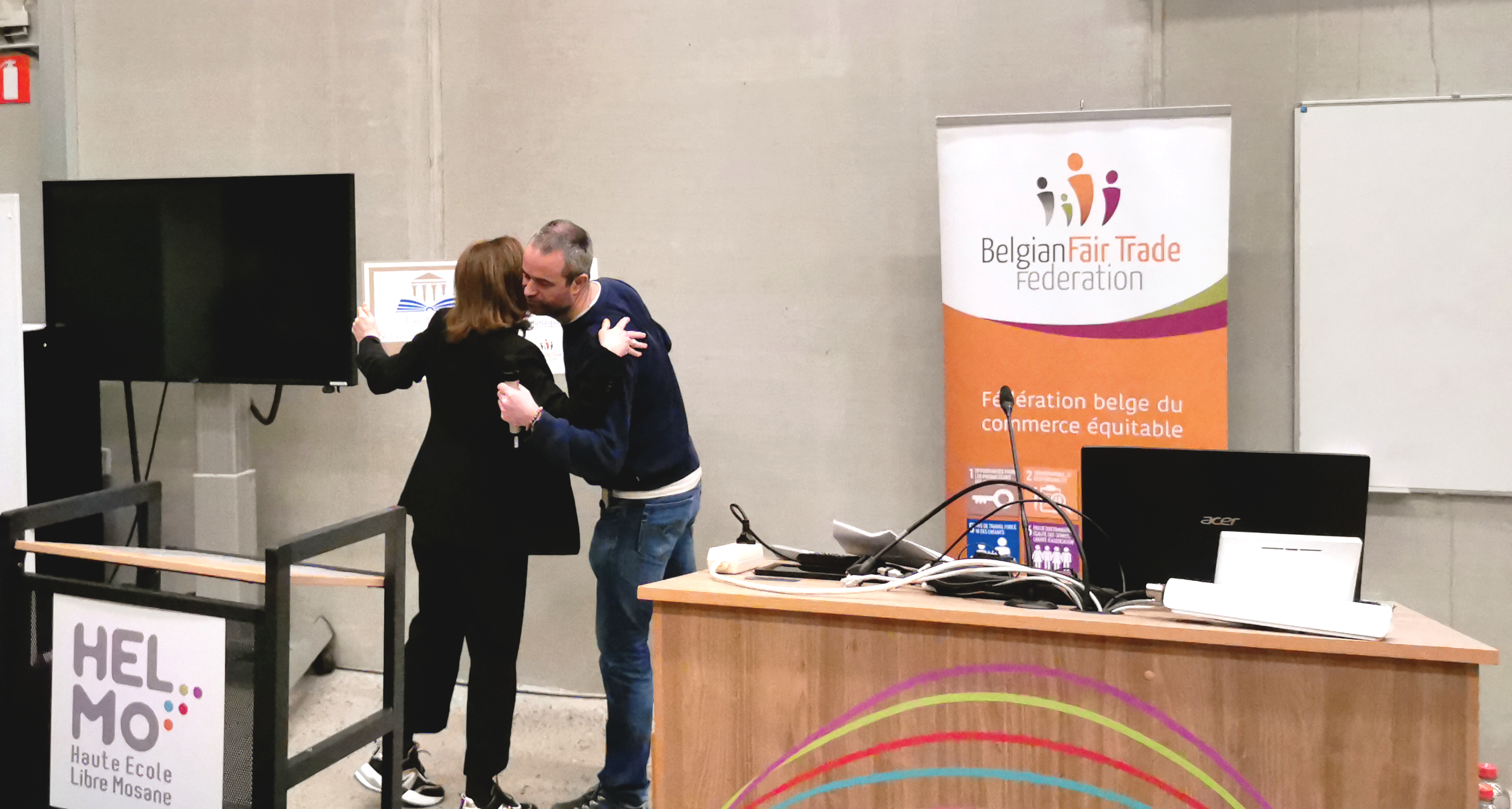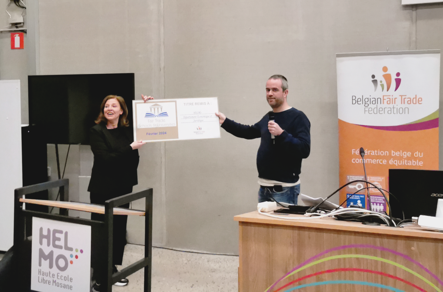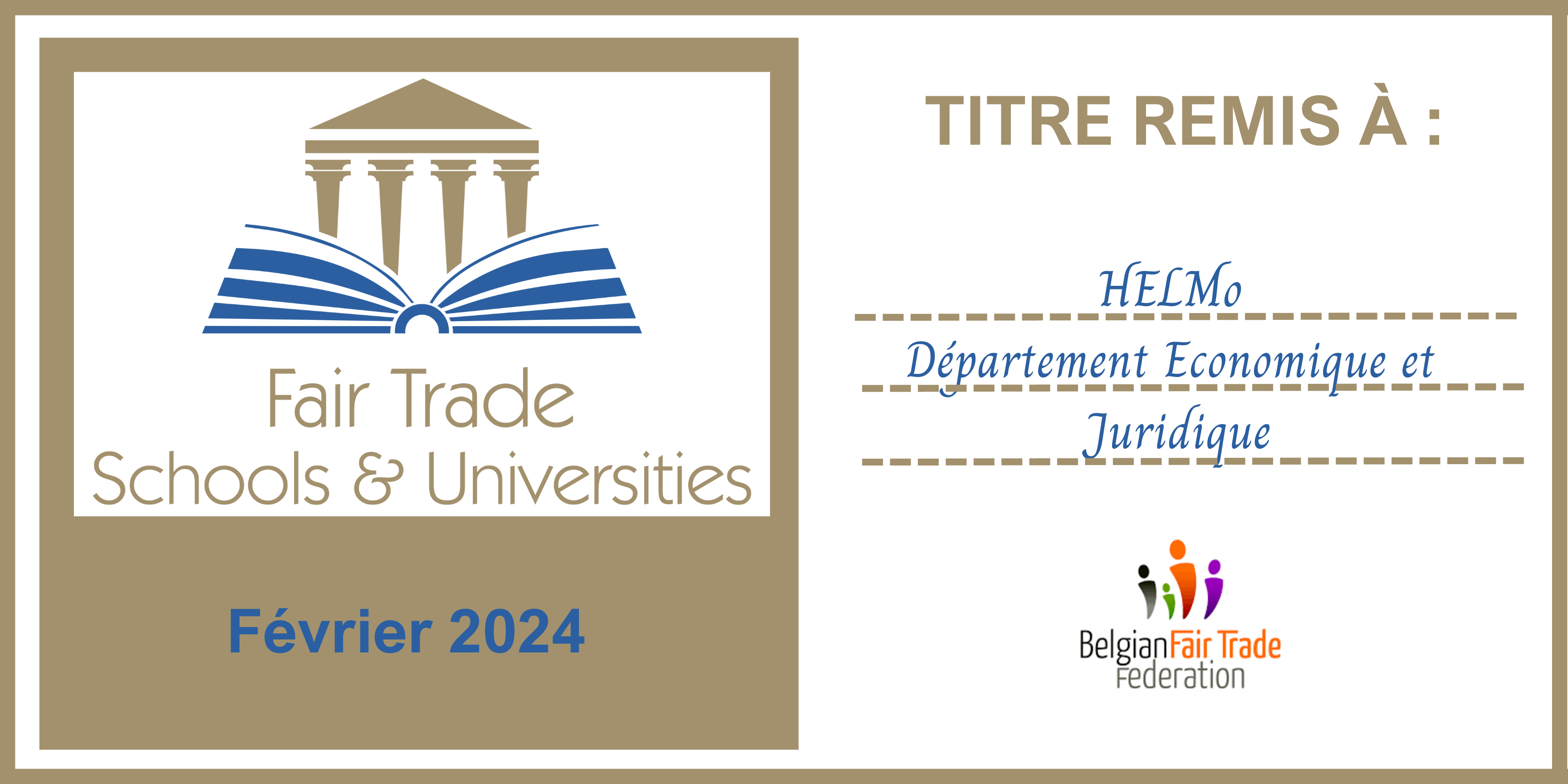Jeudi 29/02 à 17h45, le titre de Fair Trade Schools & Universities a été officiellement décerné au Département Economique et Juridique de HELMo (Campus Guillemins).