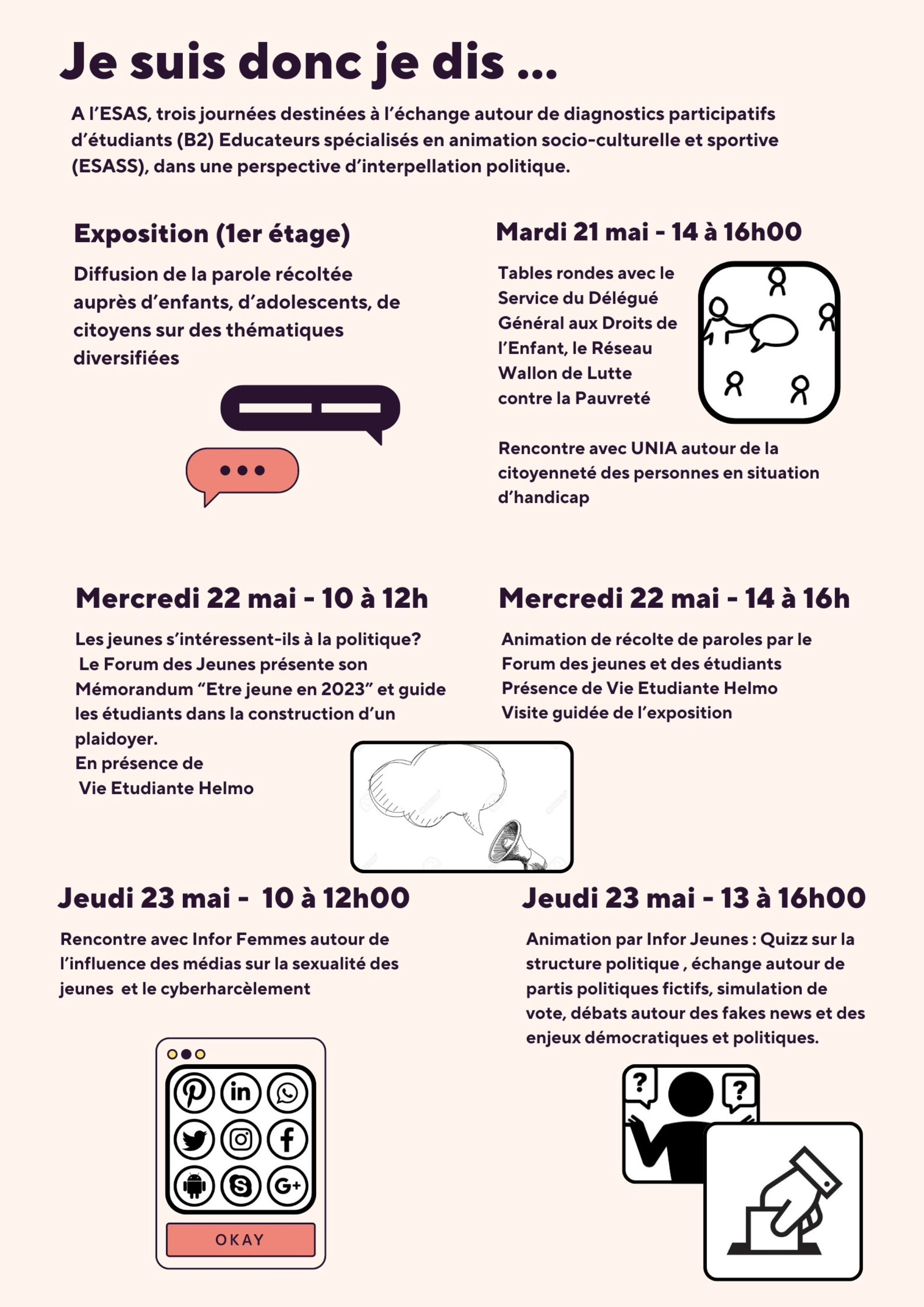 Autour de l’exposition, la semaine était ponctuée de tables-rondes, d’animations, de rencontres avec des acteurs et professionnels du secteur : Le Forum des jeunes, le Réseau de lutte contre la pauvreté, le service du Délégué général aux droits de l’enfant, UNIA, le Plope, Infor Femmes, Infor Jeunes… ont visité l’expo, animé des ateliers, écouté les plaidoyers et ils ont souligné l’intérêt de cette démarche culturelle en mouvements, animée et joyeuse !
