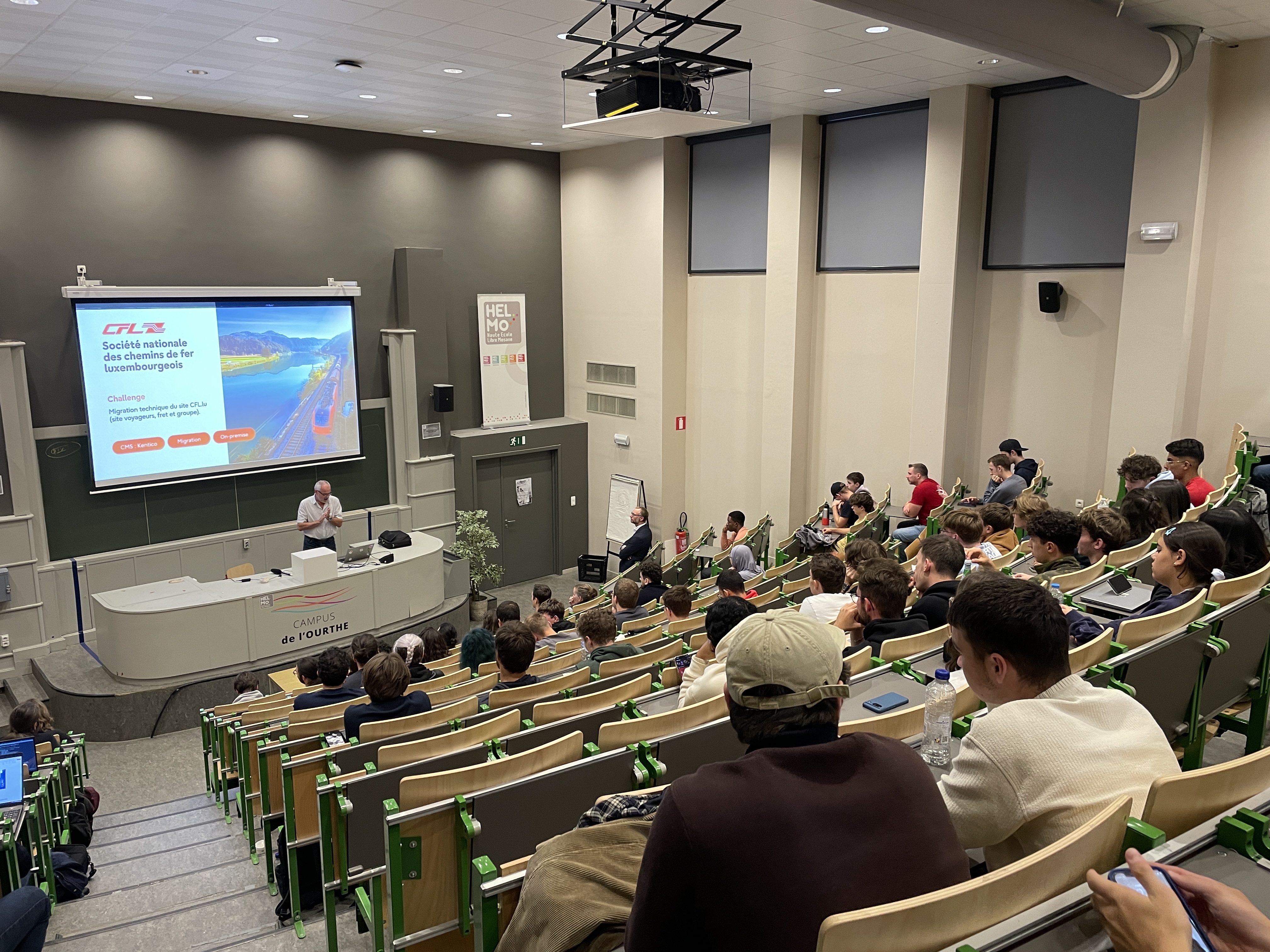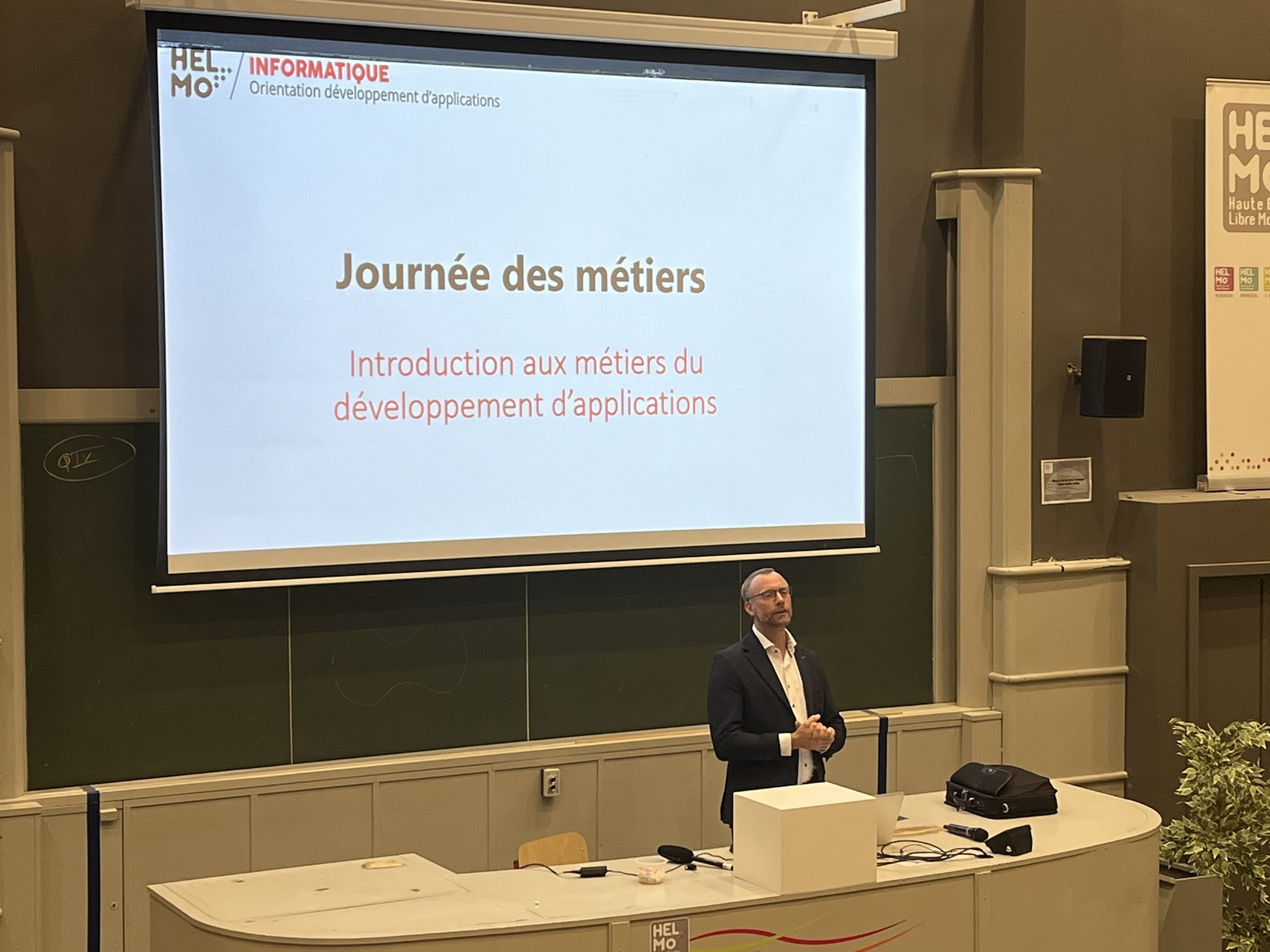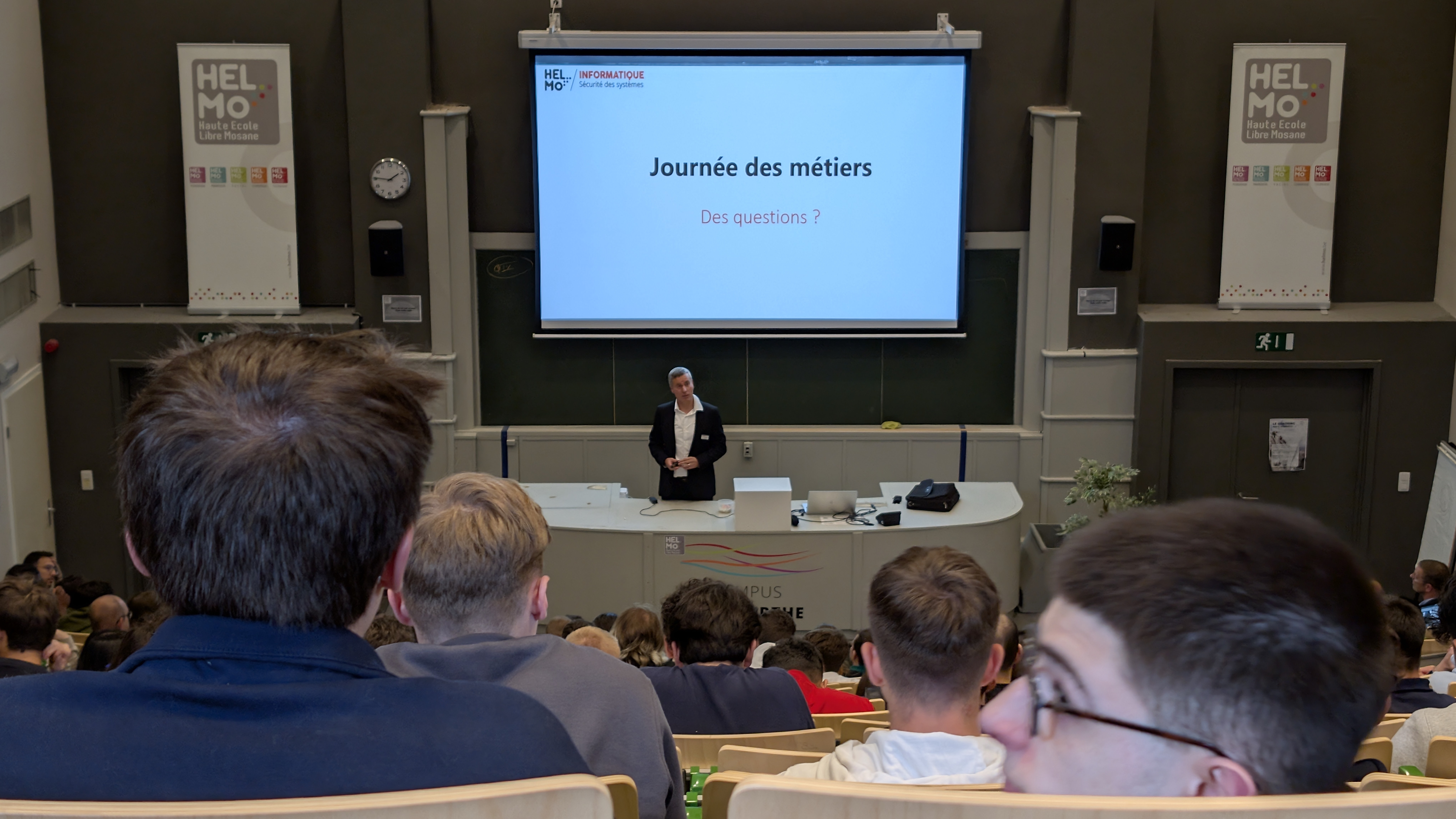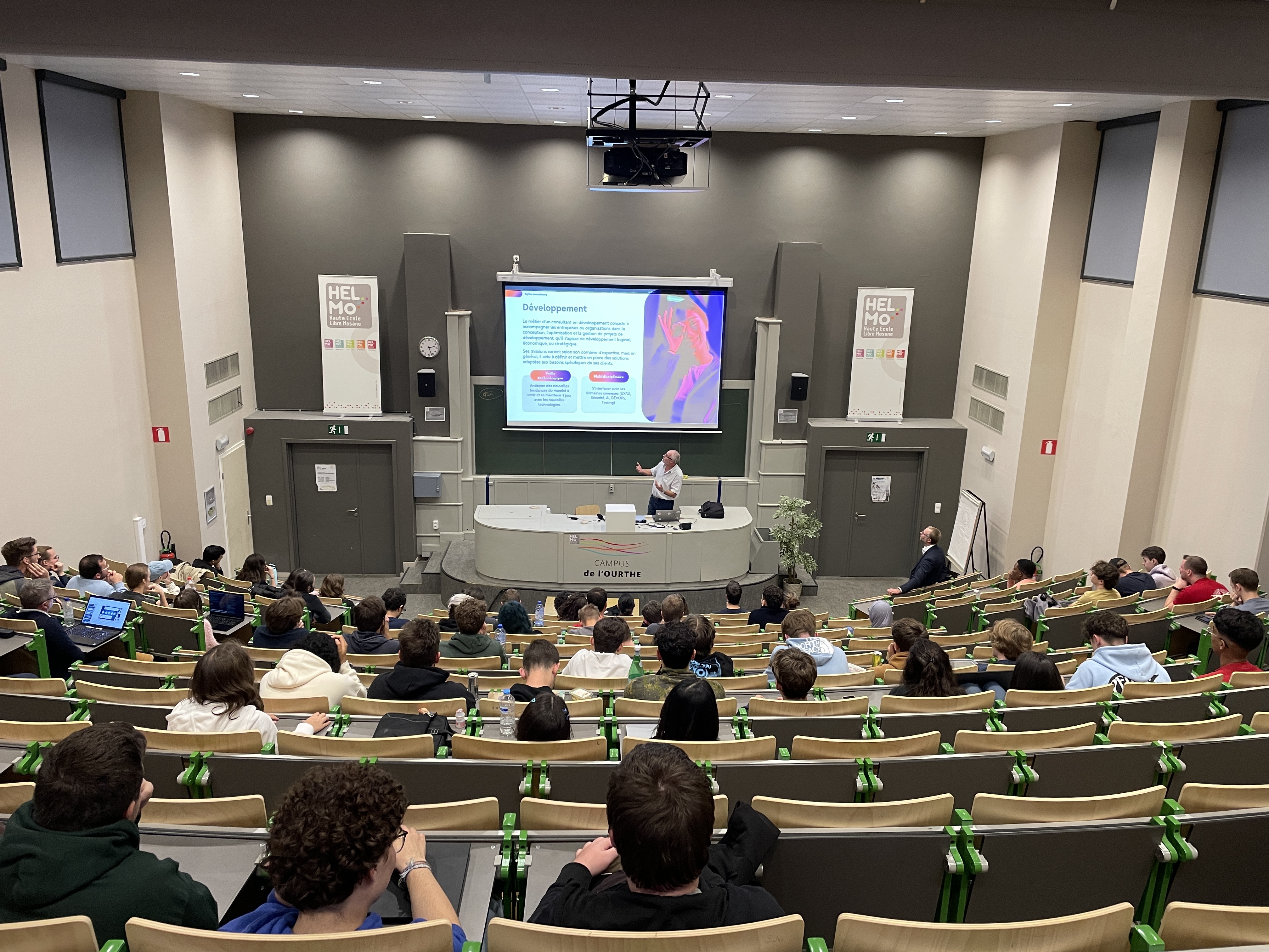 De 13h à 16h30, l’après-midi était consacré aux étudiants de 1ère année. Ils ont assisté à une présentation complète des différents profils métiers de l'informatique. Cette session, animée par la direction des cursus d’HELMo en collaboration avec les professionnels des entreprises invitées, avait pour objectif de présenter les profils métiers et les débouchés concrets de chaque orientation et d’illustrer les réalités du monde professionnel.