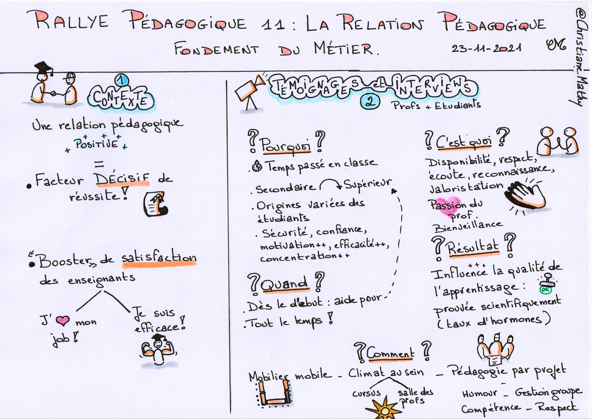« Pourquoi devons-nous nous intéresser à la facette relationnelle du métier d’enseignant ? Comment le climat de classe influence-t-il la qualité des apprentissages des étudiants ? A quel stade du quadrimestre la relation pédagogique requerrait-elle une attention particulière pour les étudiants ? La pédagogie du projet, cadre idéal pour développer la relation pédagogique ? Etc. »