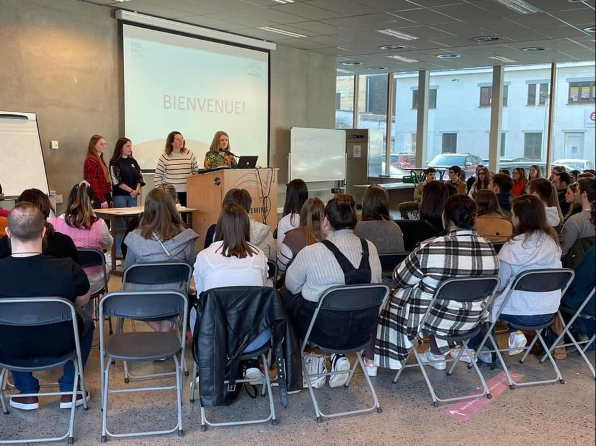 Grâce à la cohésion de tou.te.s, nous avons pu accueillir les Louvanistes pour une matinée riche en d'informations au sujet des deux partenaires. Les organisatrices ont pris la parole afin d'expliquer le programme de la journée à tous. Les directrices de cursus ont expliqué le fonctionnement des deux bacheliers, chacune dans leur langue maternelle. Le responsable des relations internationales n’a pas manqué de vanter les bienfaits des contacts avec une autre communauté linguistique : que d’opportunités d’échanges, Erasmus, bi-diplomations, bachelor na bachelor… Cela nous a donné envie d’y goûter !