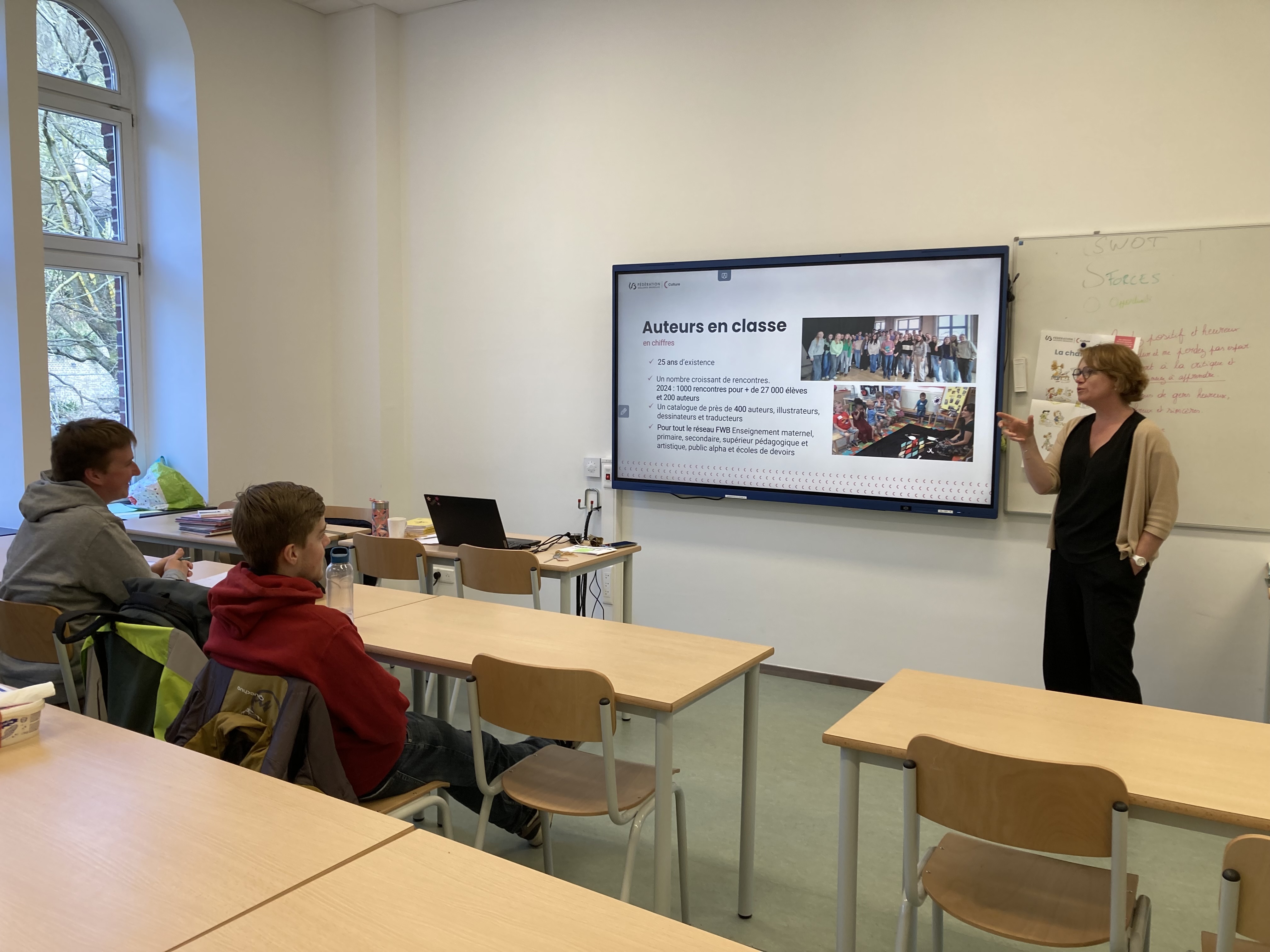 - Caroline Berger est détachée pédagogique au service des Lettres et du Livre de la FWB, qui organise la promotion de la lecture, notamment dans les classes. Elle a expliqué les démarches à mener pour inviter un auteur en classe, ainsi que les opérations qui valorisent la lecture, telles que « la fureur de lire ».