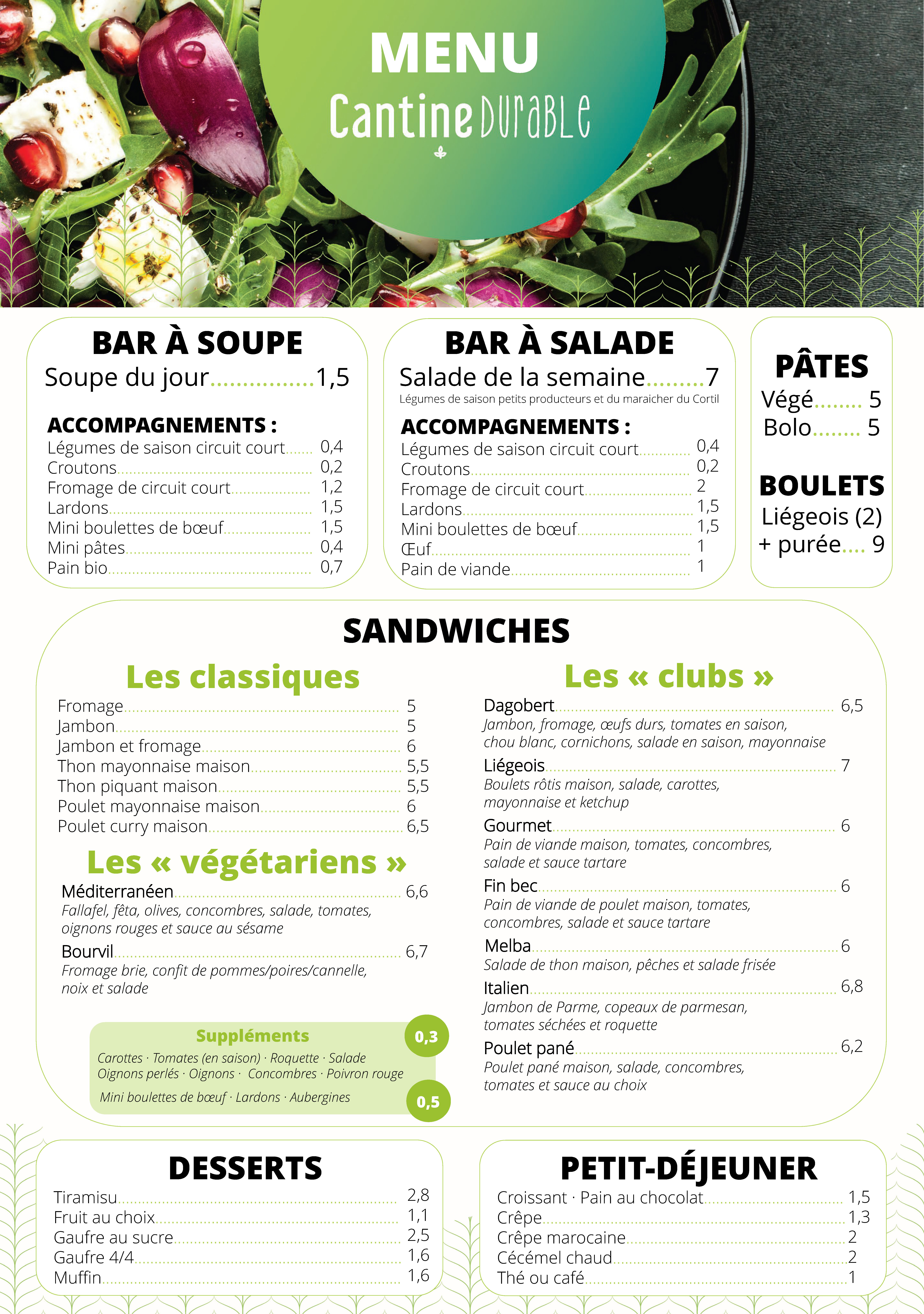 Bars à soupe et à salade, pâtes, sandwiches, petits plats, desserts… Découvrez le menu complet via le site "Cafet’Express" ou à la Cantine durable.