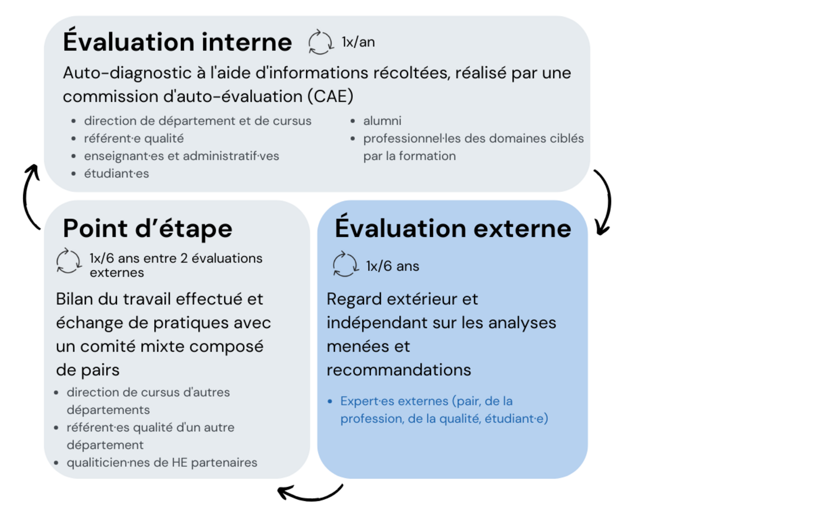 Comme l'indique le schéma ci-dessous, l'évaluation externe constitue, à côté de l'évaluation interne et du point d'étape, un des trois volets envisagés par cette démarche et