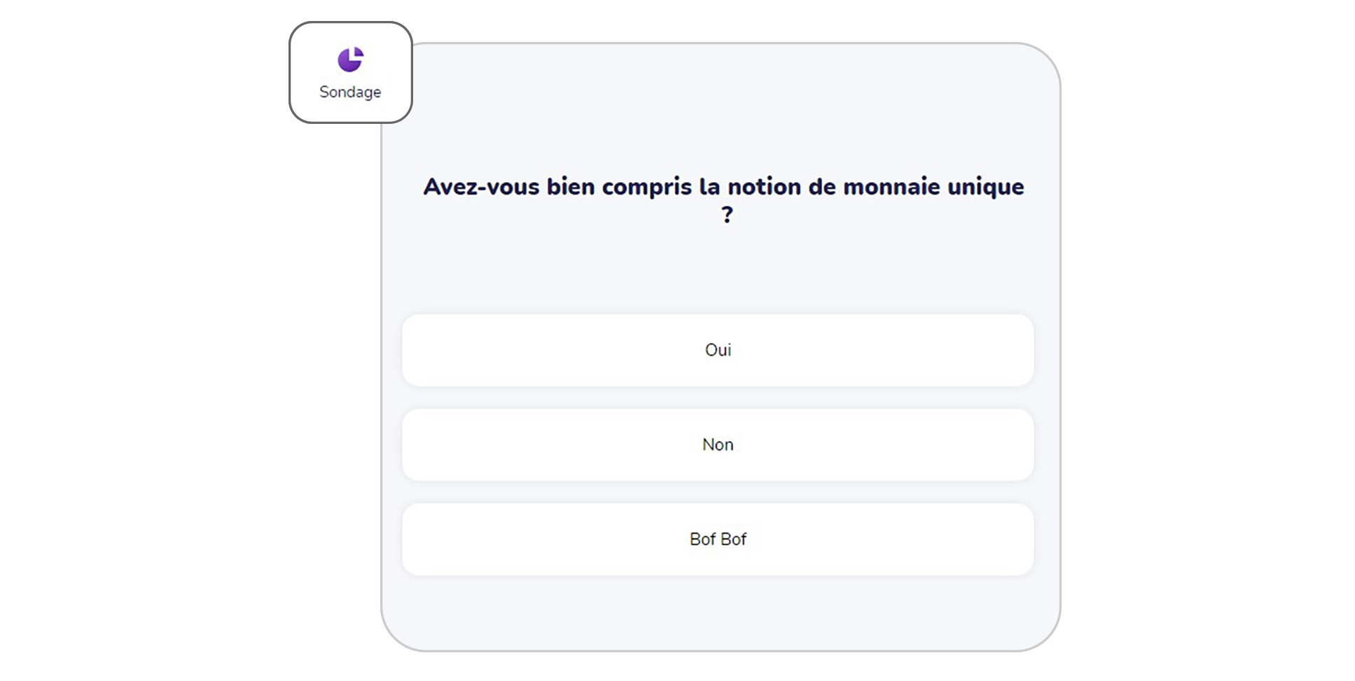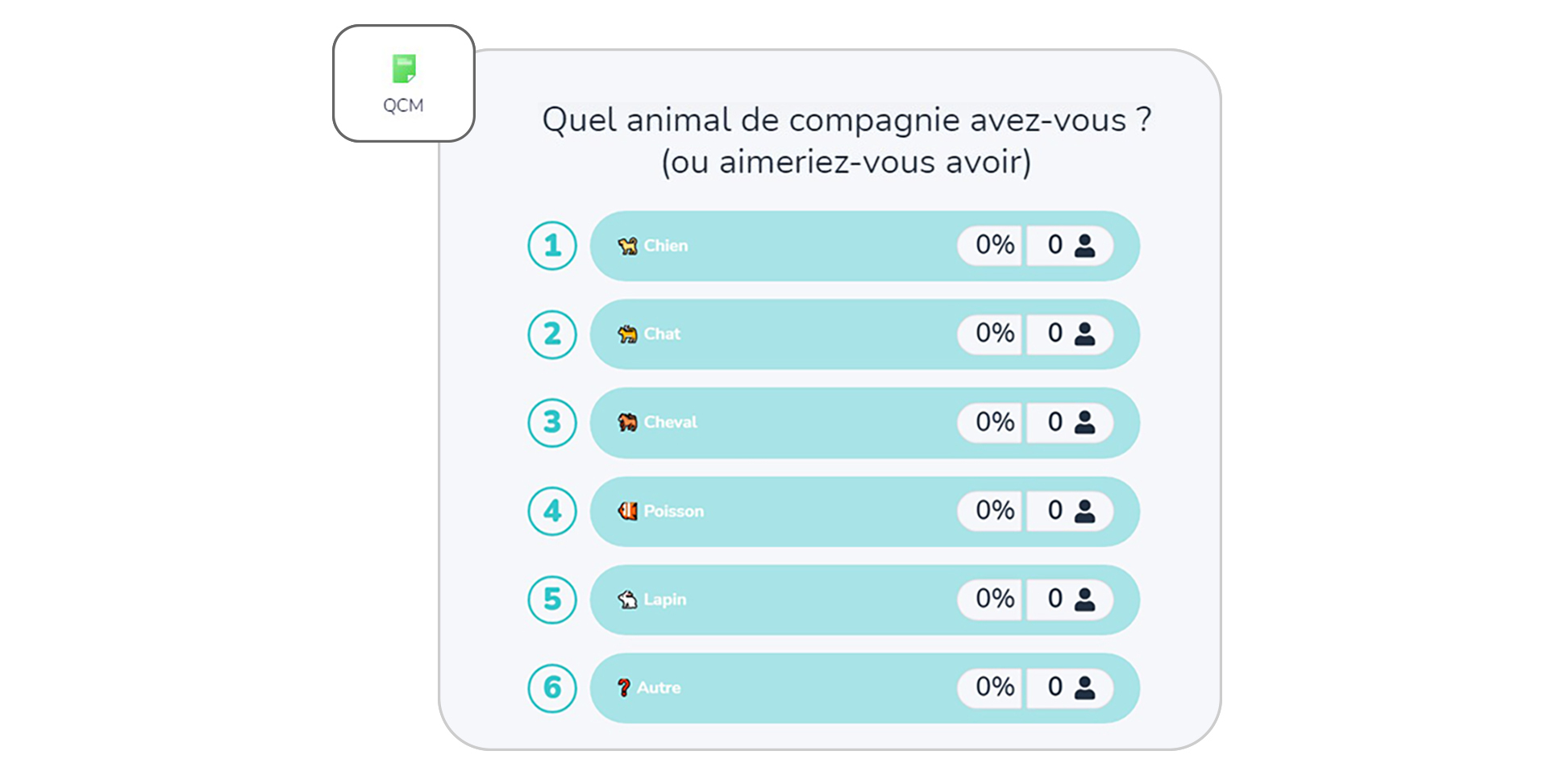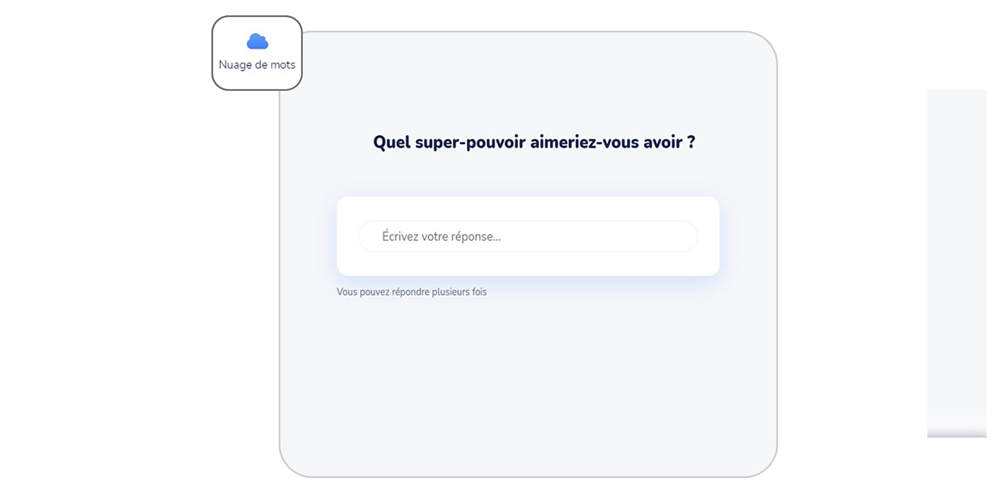 Actuellement, il existe 20 types de questions qui permettent de varier les possibilités d’interaction. Ainsi, par exemple, le « Brainstorming » peut faciliter la création d’idées, le « Trouver sur l’image » peut contribuer à briser la glace, la question « Sondage » permet de recueillir les opinions.